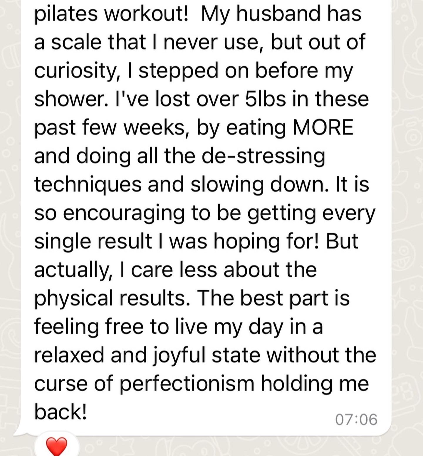 I'm naturally drawn to healthy food, I no longer feel ravenous like I used to, and I can truly trust my hunger about what & when to eat. Food is no longer a source of stress and I am a lot more mindful of what & why I eat. I exercise considerably less, and I focus on low impact workouts that create strength & length without stressing out the body. I exercise because I want to, not because I "have to make up for what I've eaten". I find it easy to be consistent with my workouts because they’re fun & make me feel great! Food & fitness are no longer things that consume my thoughts but tools I use to make my body & my mind stronger & more focused.Â